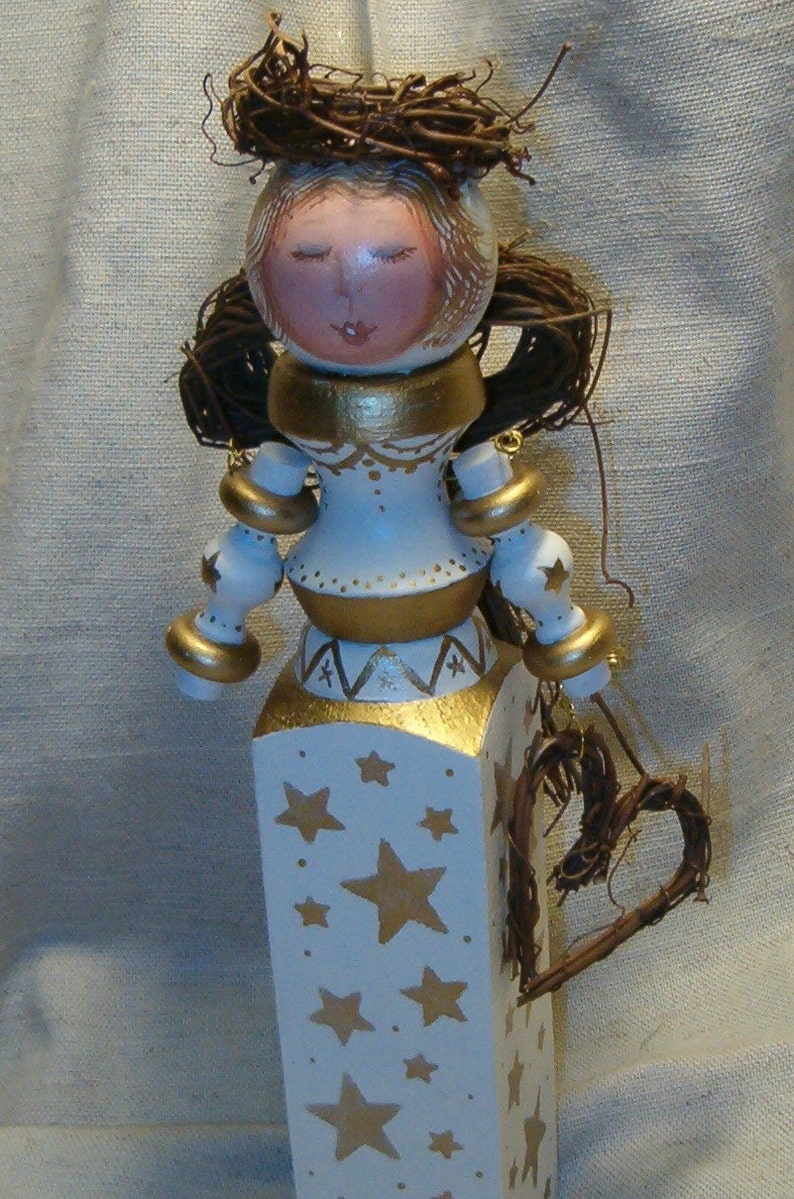 Handmade Painted Wooden Spindle Gold Star Angel image 1Handmade Painted Wooden Spindle Gold Star Angel image 2Handmade Painted Wooden Spindle Gold Star Angel image 0
